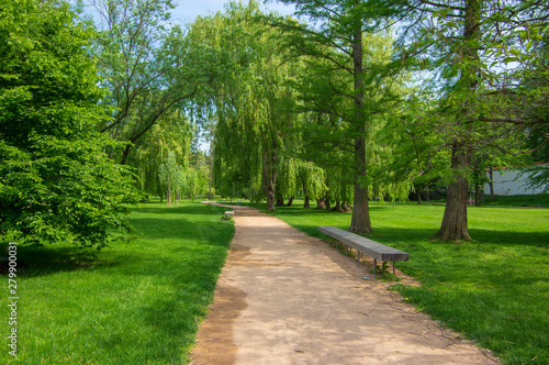 © Iva, Fototapeta premium Public park during summer in sunlight with wooden bench, beautiful willow trees alley and sandy path