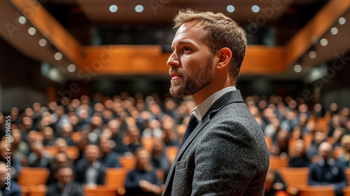 Fototapeta premium public speaker confidently addressing engaged audience in theater setting,...