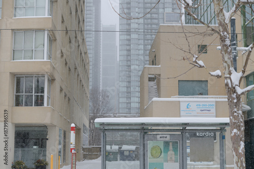 Fototapeta premium public transit shelter on Queens Quay West during a snow storm on 2026-01-15 in Toronto
