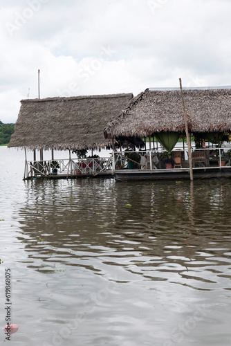 © Luis, Fototapeta premium pucallpa peru, yarinococha lagoon tourist place with boats and restaurant on the river coast