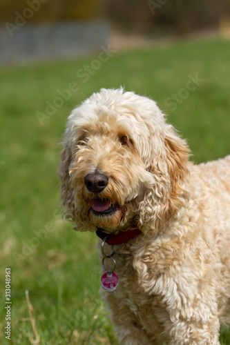 Fototapeta premium Pudel hybryda w portretach na zielonej łące.