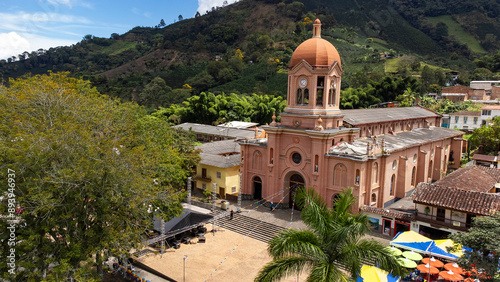 © Luis Echeverri Urrea, Fototapeta premium Pueblorrico, Antioquia - Colombia - July 21, 2024. Facade of the Catholic church located in the main park of the municipality.