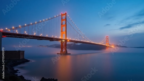 © Leonardo, Naklejka premium Puente colgante bajo el cielo crepuscular, luces delicadas brillando, aguas brumosas debajo creando una atmósfera de ensueño