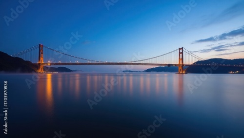 Naklejka premium Puente colgante con delgados cables y majestuosos pilares que brillan suavemente bajo un cielo crepuscular con tonos azules y morados