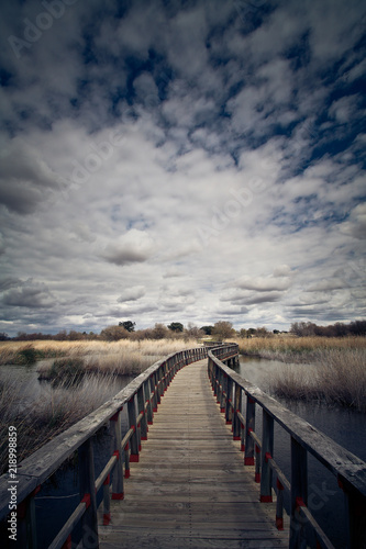 © Javier Oliver, Obraz premium Puente de madera sobre laguna en un atardecer con nubes