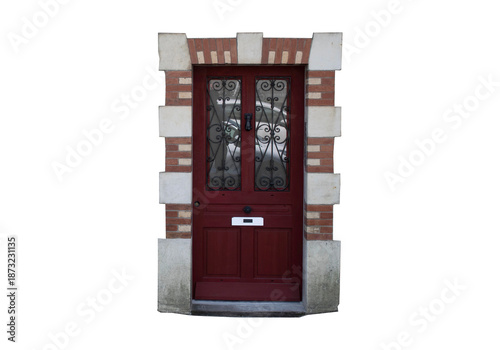 © Gabrieuskal, Fototapeta premium Puerta de entrada residencial de madera roja con marco de ladrillo y piedra