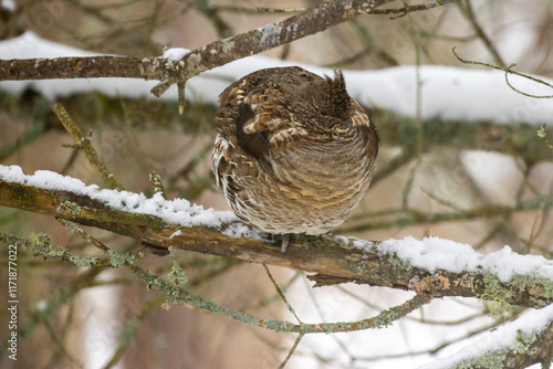 Fototapeta premium Puffed up ruffed grouse sitting in a tree.