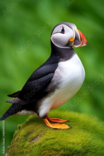 © MDBaki, Fototapeta premium Puffin bird on a green grass patch.