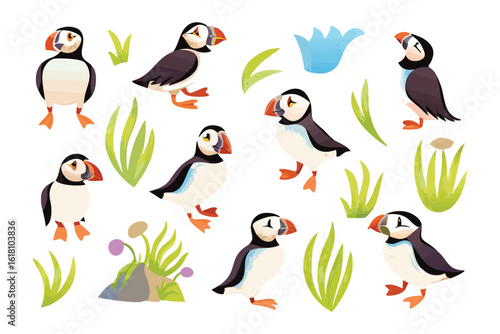 Naklejka premium Puffin Illustration Collection: A captivating array of stylized puffin illustrations, showcasing the charm of these sea birds in a whimsical nature scene, with accompanying plant elements.