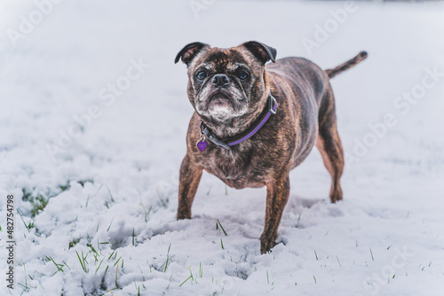 Obraz premium Pug and Boston Terrier mix called a BUG, playing in fresh snowfall
