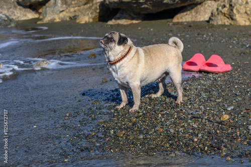 Fototapeta premium Pug enjoying a sunny day at the beach, exploring the shore and soaking in the...