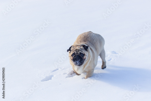 © Shcherbyna, Obraz premium pug puppy run in snow field. winter dog,