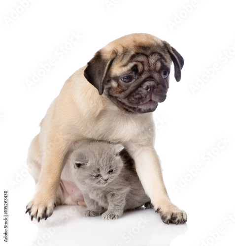 Obraz premium Pug puppy with scottish cat sitting together. Focus on cat. isol