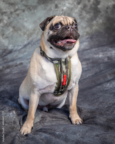 Obraz premium Pug sits on floor with grey background