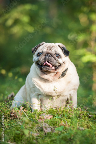 © Rita Kochmarjova, Fototapeta premium Pug sitting on the hill in the forest