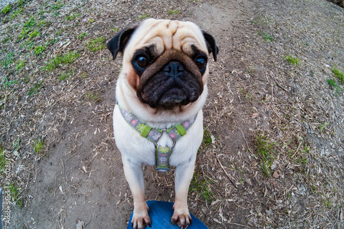 © Elena Blokhina, Fototapeta premium Pug walks in early spring.