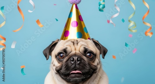 Obraz premium Pug with Party Hat: A lovable pug wearing a festive party hat, surrounded by...