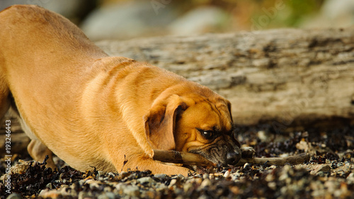 © everydoghasastory, Fototapeta premium Puggle dog outdoor portrait bowing down at rocky beach