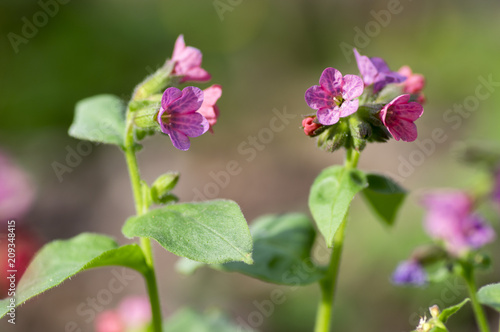 © Iva, Fototapeta premium Pulmonaria officinalis in bloom, early springtime flowering herb, group of pink purple and blue violet flowers with leaves
