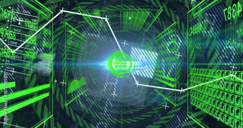 © vectorfusionart, Naklejka premium Pulsing central glowing circular hub projecting lines in simulated digital corridor, with UI panels