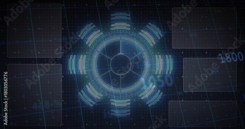 Fototapeta premium Pulsing central HUD showing ringed reticle and ticks in virtual console with...