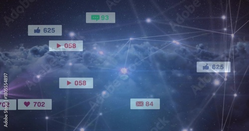 © vectorfusionart, Obraz premium Pulsing central network node and notification badges hovering over cloud layer, showing counts