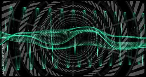 © vectorfusionart, Fototapeta premium Pulsing glowing teal dotted waveform stretching across virtual tunnel, with vertical spike lines