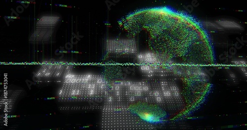Obraz premium Pulsing point-cloud globe glowing right over dot-matrix plane, showing binary...