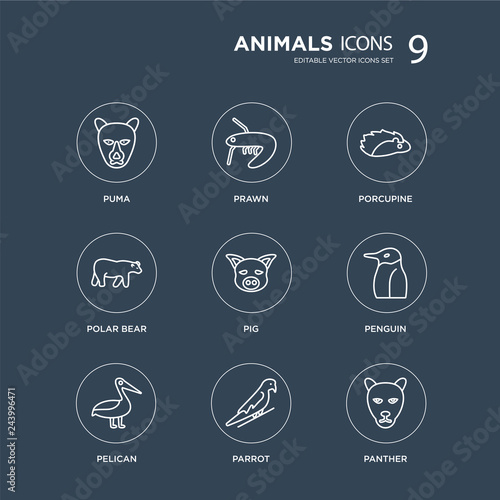 Fototapeta premium 9 puma, Prawn, Pelican, Penguin, Pig, porcupine, Polar bear, Parrot modern icons on black background, vector illustration, eps10, trendy icon set.