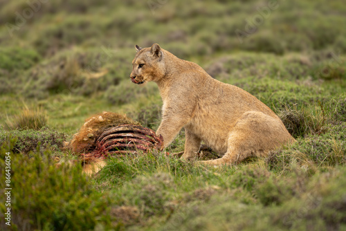 © Nick Dale, Naklejka premium Puma sits with guanaco carcase licking lips
