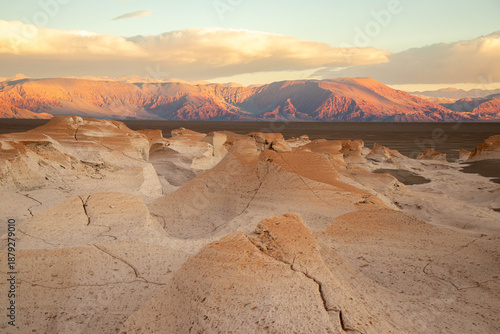 © Fede, Fototapeta premium Pumice Stone Field Landscape with Mountains at Sunset in Catamarca, Argentina
