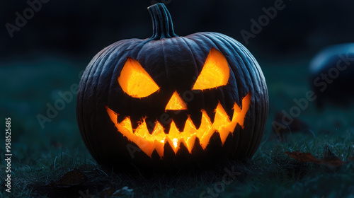 © Kanyanat, Fototapeta premium Pumpkin carving featuring a spooky face with glowing eyes.