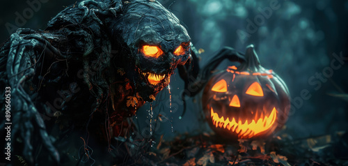 Fototapeta premium Pumpkin Monster Demon with Jack-o-Lantern in the Halloween Night Horror