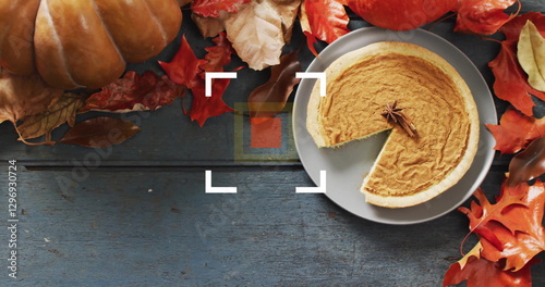 © vectorfusionart, Fototapeta premium Pumpkin pie on plate with autumn leaves and pumpkins, focus image over scene