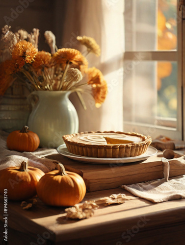 Naklejka premium Pumpkin pie on the wooden table in the countryside kitchen