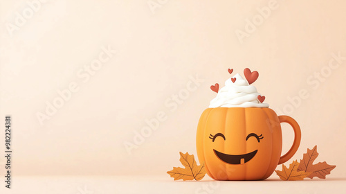 Fototapeta premium Pumpkin spice latte in a cute smiling pumpkin mug, whipped cream on top with hearts and fall leaves around, warm and whimsical illustration, copy space