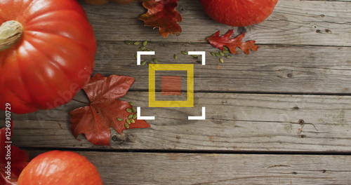 © vectorfusionart, Fototapeta premium Pumpkins and autumn leaves on wooden background with focus image