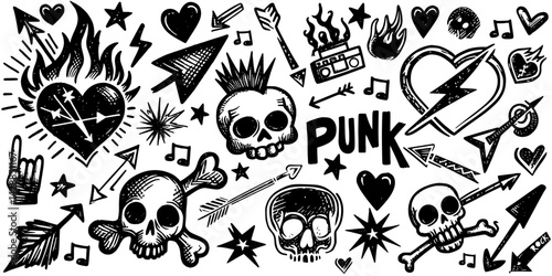Fototapeta premium Punk Rock Doodle Art - Skulls, Hearts, and Symbols, black-and-white doodle illustration features various punk rock-themed elements, including skulls, hearts, arrows, stars, musical notes, and the word
