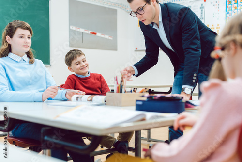 © Kzenon, Fototapeta premium Pupils and teacher cooperating in teamwork exercise