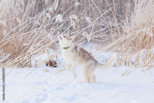 Fototapeta premium puppies playing in the snow husky