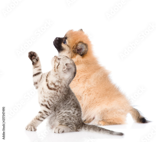 Obraz premium puppy and playful kitten looking up together. isolated on white background