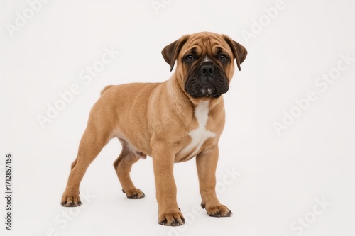 Fototapeta premium Puppy bullmastiff posing against plain white backdrop