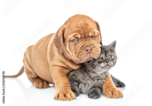 © Ermolaev Alexandr, Fototapeta premium Puppy embracing kitten. isolated on white background