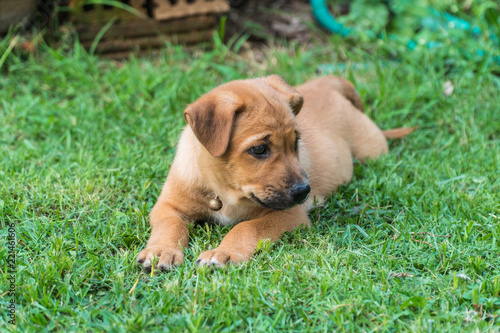 Fototapeta premium Puppy is sitting on the home garden.