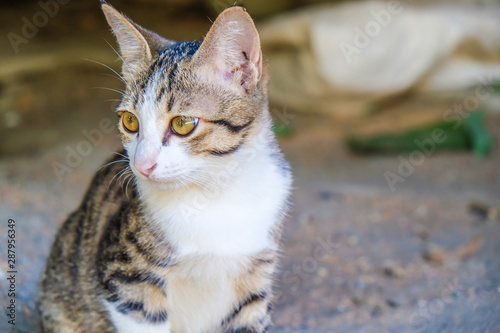 Fototapeta premium Puppy kitten cat reclining on soil floor