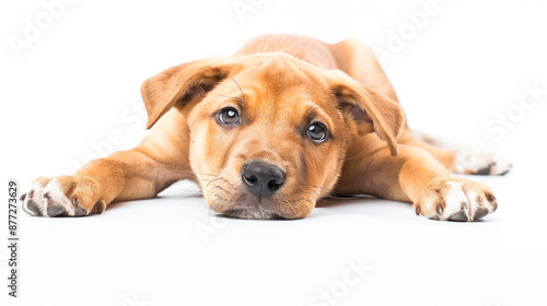 Obraz premium Puppy lying down with head resting on white surface