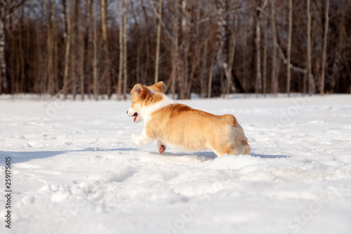 Fototapeta premium Puppy of funny red welsh corgi pembroke walk outdoor, run, having fun in white snow park, winter forest. Concept purebred dog, champions for sale, lost cur, castration, sterilization