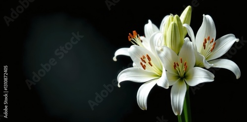 © Yuwadee, Fototapeta premium Pure white lilies cluster on black, dramatic lighting, bloom, simple