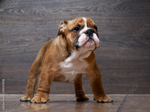 Obraz premium Purebred English bulldog puppy. Puppy 3 months. Dog standing on the wooden...