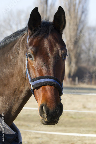 Obraz premium Purebred horse posing in the stable door on animal farm in blanket